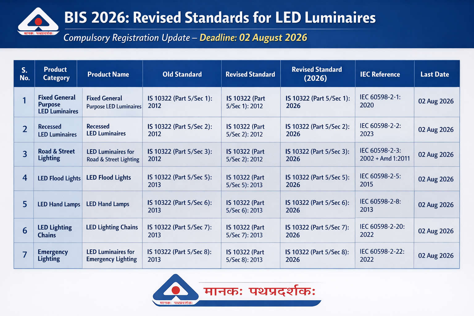 The BIS LED Luminaires Update 2026 is a regulatory revision of Indian standards governing LED lighting products.